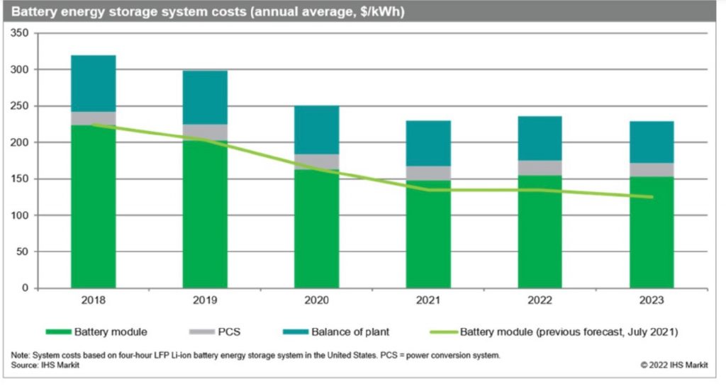 ایک حالیہ وائٹ پیپر میں، آئی ایچ ایس مارکیت نے پیش گوئی کی ہے کہ خام مال کی بڑھتی ہوئی قیمتیں 2024 تک EV بیٹری کی قیمتوں میں مزید کمی کو روکے رکھیں گی۔ اس تجزیہ نے پیش گوئی کی ہے کہ اوسطاً 2022 کی EV بیٹری کی قیمتیں 2021 کے مقابلے میں 5% زیادہ ہوں گی، جس کی زیادہ تر وجہ خود کار قیمتوں میں اضافہ ہے۔ لتیم آئرن فاسفیٹ (LFP) بیٹریوں کی صنعت کی مانگ۔